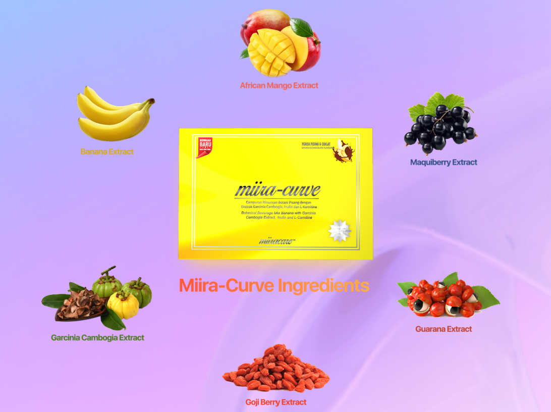Miira-Curve contains Garcinia Cambogia Extract, Hoodia Gordini Extract, L-Carnitine, African Mango Extract, and Guarana Extract, which are commonly associated with weight loss support.